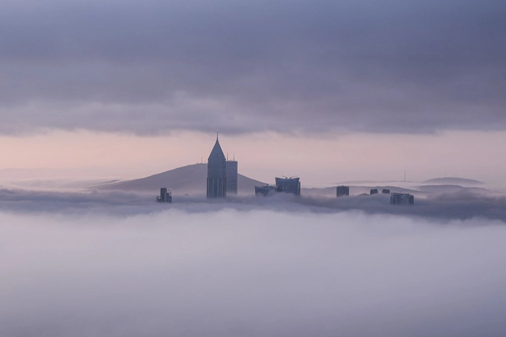 Kentte etkili olan sis nedeniyle yüksek katlı binaların üst kısımları görünmez hale geldi.