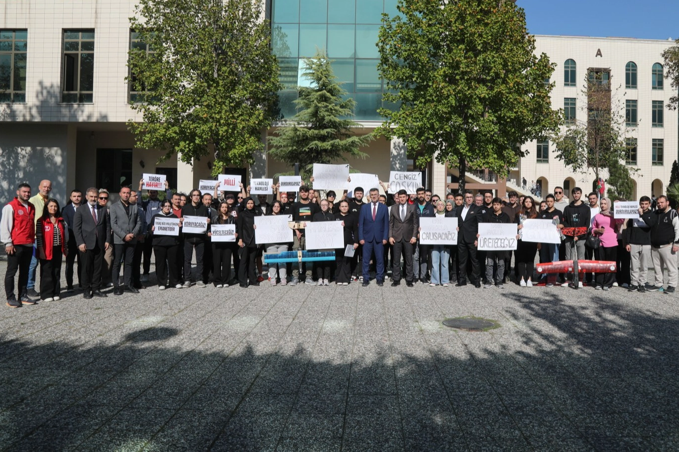 BURSA (İGFA) - Türk Havacılık ve Uzay Sanayii'nin (TUSAŞ) Ankara'nın Kahramankazan ilçesindeki merkez yerleşkesine teröristlerce yapılan hain saldırıya, Bursa Teknik Üniversitesinden tepki geldi. BTÜ Uzay Havacılık ve Savunma Sanayii ile Makine Teknolojileri Robot ve Otomasyon Toplulukları öncülüğünde BTÜ’lü öğrenciler, yaptıkları basın açıklamasıyla terör saldırısını kınadı. Öğrencilerin düzenlediği tepki açıklamasına; BTÜ Rektörü Prof. Dr. Naci Çağlar, Rektör Yardımcıları Prof. Dr. Sinan Uyanık ve Prof. Dr. Barış Tamer Tonguç, ASKON Bursa Şube Başkanı Emre Yıldız ve yönetim kurulu üyeleri ile üniversite personeli de destek verdi. Basın açıklaması, saldırıda hayatını kaybeden şehit ve gaziler için saygı duruşu ve İstiklal Marşı ile başladı.
