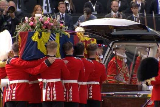 Kraliçe'nin Krlaiyet Sancağı'na sarılı tabutunun üzerinde İmparatorluk Tacı, Hükümdar'ın altın küresi ve asası bulunuyor.