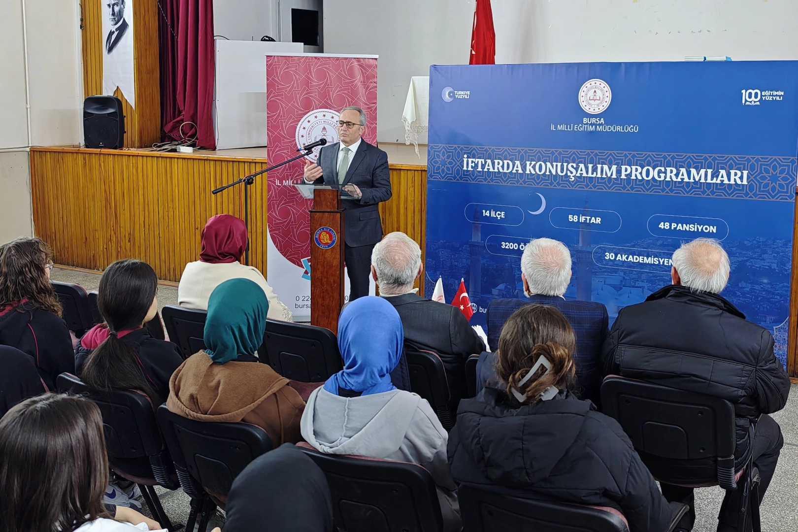 Bursa İl Millî Eğitim Müdürü Dr. Ahmet Alireisoğlu, yaptığı konuşmada gençlerin akademik ve manevi gelişiminde aile ve toplumun rolünün büyük olduğunu vurguladı. Alireisoğlu, öğrencilerin hem bilgi hem de değerler açısından desteklenmesi için okunan kitaplar ve verilen derslerin önemine dikkat çekti.