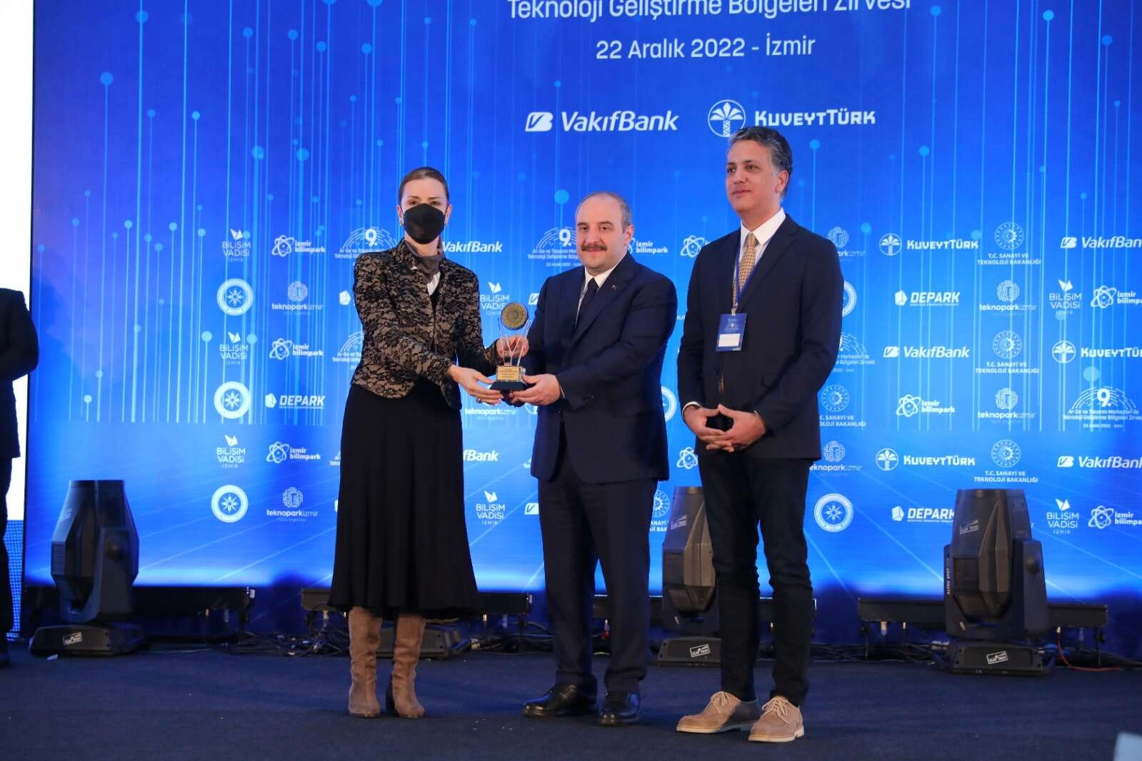 İZMİR (İGFA) - “Gelişmekte Olan Teknoloji Geliştirme Bölgeleri” kategorisinde üçüncülük ödülünün sahibi olan Dokuz Eylül Üniversitesi’ne ödülünü Sanayi ve Teknoloji Bakanı Mustafa Varank verdi. DEÜ Rektörü Prof. Dr. Nükhet Hotar, kent ekonomisine ihracat katkısı 10 milyon doları aşan DEPARK’ın başarısının tesadüf olmadığını söyleyerek, “Bilim ve teknolojiye yaptığımız yatırımların meyvelerini toplamaya devam ediyoruz” dedi.