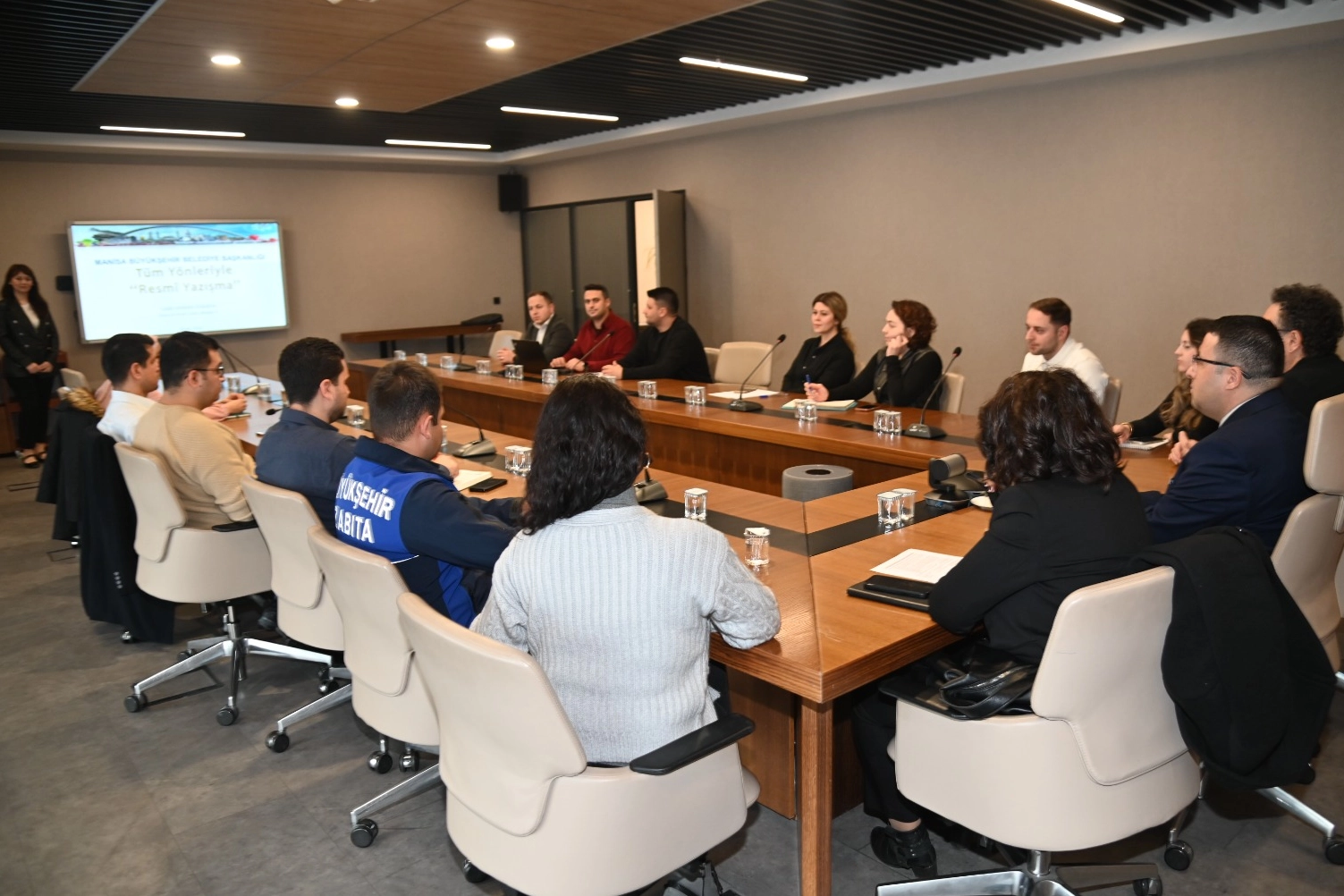 MANİSA (İGFA)- Manisa Büyükşehir Belediyesi, Yazı İşleri ve Kararlar Dairesi Başkanlığı ile İnsan Kaynakları ve Eğitim Dairesi Başkanlığı iş birliğiyle “Resmi Yazışma Kuralları” eğitimi düzenledi.
