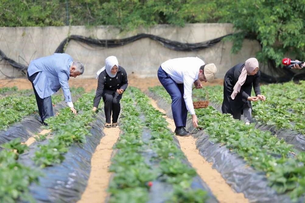 İSTANBUL (İGFA) - İstanbul Büyükşehir Belediye (İBB) Başkanı Ekrem İmamoğlu, 2020 yılından bu yana İstanbullu çiftçilere verdikleri ücretsiz fide desteğinin meyvelerini, yine hemşehrisi üreticilerle birlikte toplamaya devam ediyor. Bu yılın ‘hasat etkinliği’ için Sarıyer’in seralarıyla ünlü köyü Gümüşdere’yi seçen İmamoğlu, ilk olarak çilek üreticisi Ebru-Ferit Berber çiftinin tarlasına, Sarıyer Belediye Başkanı Şükrü Genç ile birlikte konuk oldu. Ebru Berber ve kendisi gibi üretici olan ablası Funda Demircan ile birlikte çilek toplayan İmamoğlu, hasat etkinliğini Saniye-Birol Berber çiftinin serasında devam ettirdi. Dalından topladığı taze domatesleri, salatalıkları, biberleri sepete dolduran İmamoğlu, köy halkıyla da futbol sahasına kurulan etkinlik çadırında buluştu.