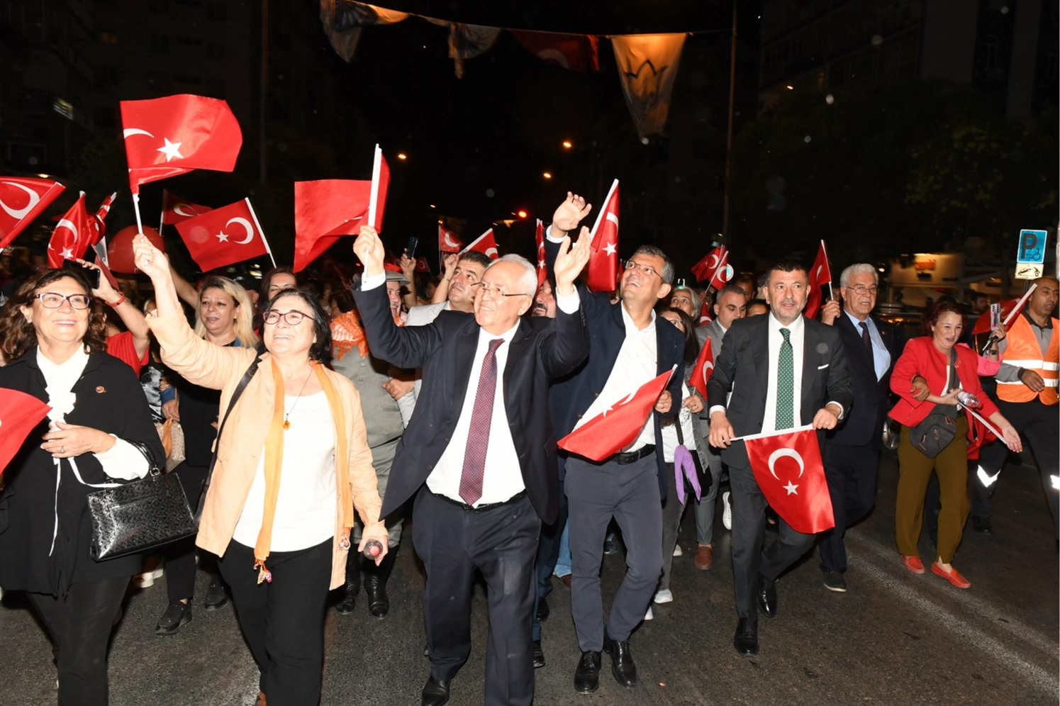 CHP Grup Başkanvekili Özgür Özel de, “Kortej yürüyüşümüzde sağ taraf Karabağlar, sol tarafı Konak’tı. Buram buram İzmir’i, buram buram Cumhuriyeti iliklerimize kadar hissettik. Bu güzel geceyi düzenleyen Başkanımız Muhittin Selvitopu başta olmak üzere herkese ve katılarak güç veren sizlere çok teşekkür ediyoruz. Cumhuriyet Bayramımız kutlu olsun” diye konuştu.