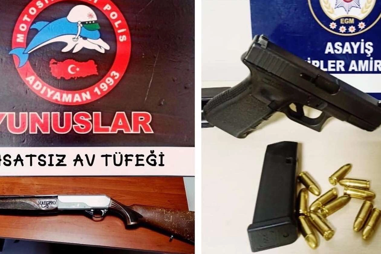 Buna göre Adıyaman'daki uygulamalarda; 6 adet ruhsatsız tabanca, 4 adet ruhsatsız tüfek, 4 adet kuru sıkı tabanca, 7 adet çalıntı motosiklet, 18 adet tescilsiz motosiklet, 5 adet uyuşturucu madde ele geçiren ekipler aranan 45 şahsı da yakaladı.