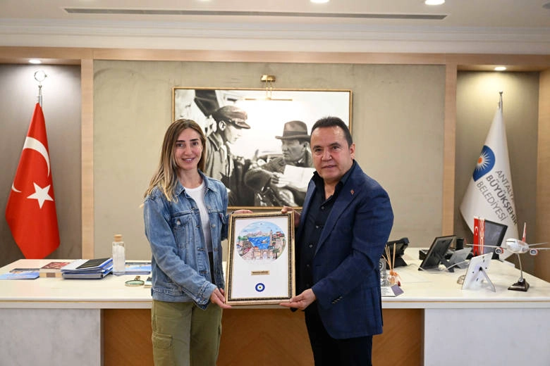Başkan Muhittin Böcek, Milli sporcu Şahika Ercümen ile bir sürü sohbet ederek, günün anısına bir plaket takdim etti. Başkan Böcek, 28 Ekim Cumartesi günü gösteri dalışı yapacak Milli sporcu Şahika Ercümen’e başarılar diledi.