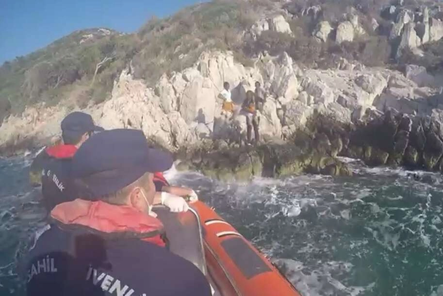 Karadan ulaşımı olmayan adaya ulaşan ekipler kayalıklarda 7 düzensiz göçmeni tespit ederek kurtarma çalışmalarına başladı.