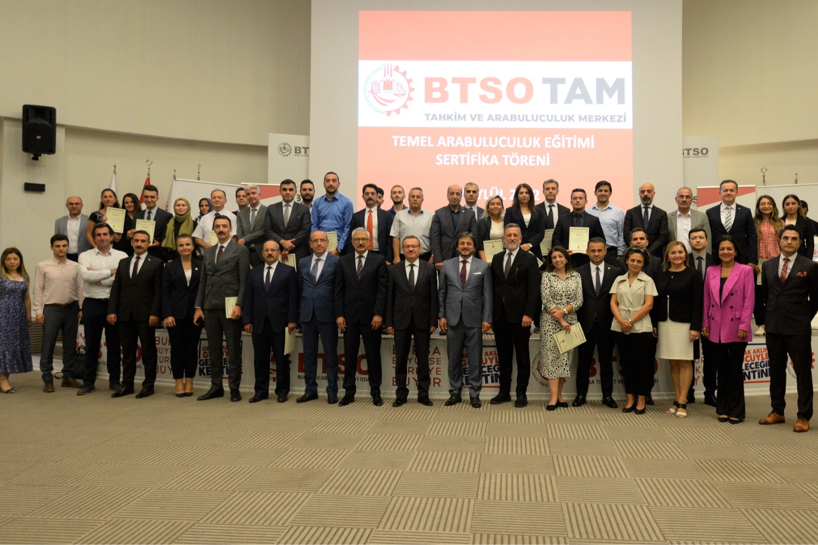 Konuşmaların ardından protokol üyeleri, eğitimleri tamamlayan 85 kursiyere sertifikalarını takdim etti. Programa, BTSO Yönetim Kurulu Üyesi ve BTSO TAM Divan Başkanı Irmak Aslan, BTSO Yönetim Kurulu Üyeleri Aytuğ Onur, Haşim Kılıç ile Yüksel Taşdemir de katıldı.