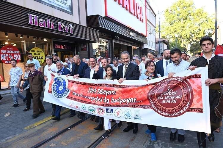 BURSA (İGFA) - Bursa Büyükşehir Belediyesi’nin koordinasyonunda Keles Belediyesi işbirliği ile Bursa Valiliği, Bursa Kültür Turizm ve Tanıtma Birliği, Türkiye Geleneksel Spor Dalları Federasyonu, Dünya Etno Spor Konfederasyonu, Türksoy ve Türk Dünyası Belediyeler Birliği’nin katkılarıyla bu sene 5’inci kez düzenlenen Türk Dünyası Ata Sporları Şenliği, Cumhuriyet Caddesi’nde kortej yürüyüşüyle başladı. Büyükşehir Belediye Başkanı Alinur Aktaş, Bursa Milletvekili Ahmet Kılıç, Keles Belediye Başkanı Mehmet Keskin, Orhaneli Belediye Başkanı Ali Aykurt, AK Parti İl Başkanı Davut Gürkan ve sivil toplum kuruluşlarının temsilcilerinden oluşan protokol üyeleri, Cumhuriyet Caddesi girişinden Fomara 15 Temmuz Demokrasi Meydanı’na kadar yürüyerek, halkı selamladı. Protokol üyelerinin yürüyüşüne, Osmanlı savaş müzikleriyle mehter takımı ve rahvan atları derneği ekipleri de eşlik etti. Yürüyüş sonunda Kazakistan’dan gelen misafirler, geleneksel halk danslarını sergiledi. Birbirinden farklı figürler sergileyen ekip, Bursalıların yoğun ilgisini çekti.