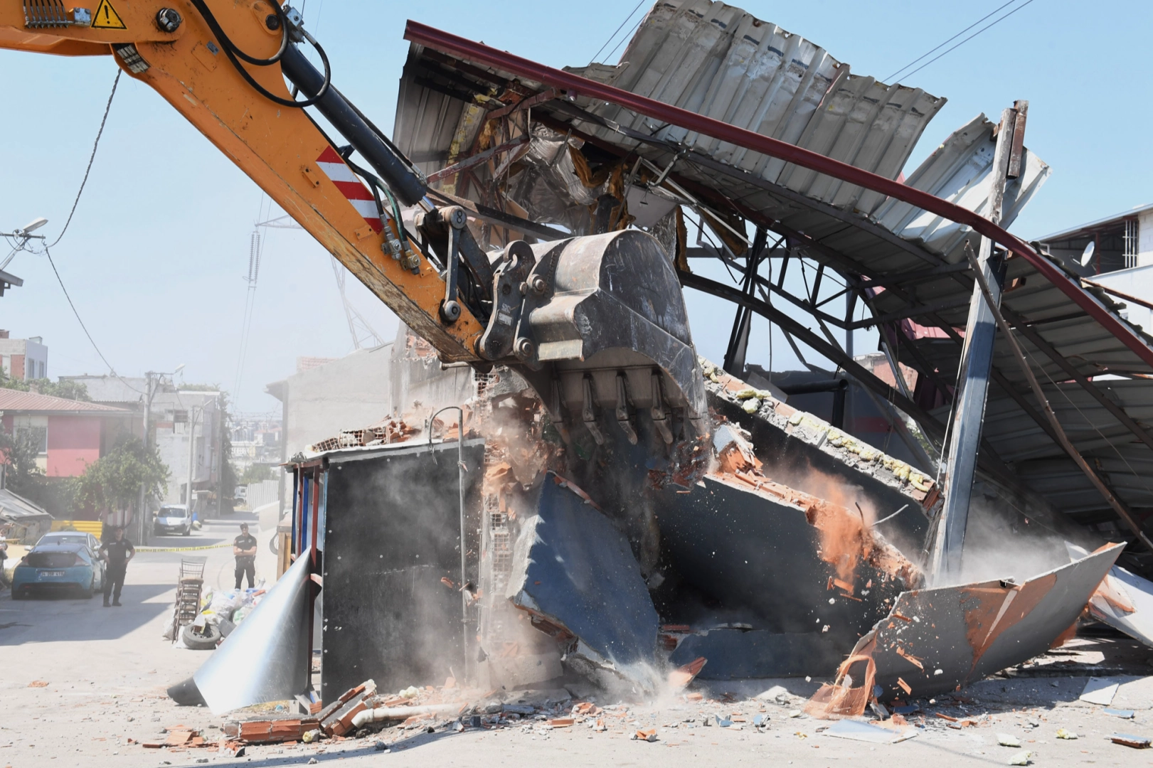 BURSA (İGFA) - Bursa Osmangazi Belediyesi, ilçenin dört bir yanındaki kaçak binaları tespit ederek yıkıyor. Yapı Kontrol Müdürlüğü ekipleri tarafından Geçit Mahallesi'nde ruhsatsız olduğu belirlenen iş yeri, yasal işlemlerinin tamamlanmasının ardından iş makinesi ile yıkıldı. Kaçak işyerinin, 154 bin voltluk yüksek gerilim hattının altına inşa edilmiş olması ise dikkat çekti. Belediye ekipleri, büyük bir dikkatle yıkımları gerçekleştirdi. Geniş güvenlik tedbirleri altında gerçekleştirilen yıkımlarda herhangi bir olumsuzluk yaşanmadı.