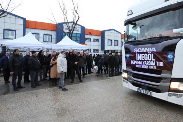İnegöllü vatandaşların yardım seferberliği ile7’den 70’e bir olup ihtiyaç duyulan malzemelerin toplanmasıyla birlikte içerisinde battaniye, ilk yardım seti, ısıtıcı, su, uyku tulumu, çocuk bezi ve maması, çadır, kışlık giyecek, konserve ve yiyeceklerin bulunduğu 5 tır dolusu yardım malzemeleri deprem bölgelerine ulaşmak üzere İnegöl’den yola çıktı. İnegöl protokolü vatandaşlarla birlikte İnegöl Belediyespor önünden tırları uğurulardı.