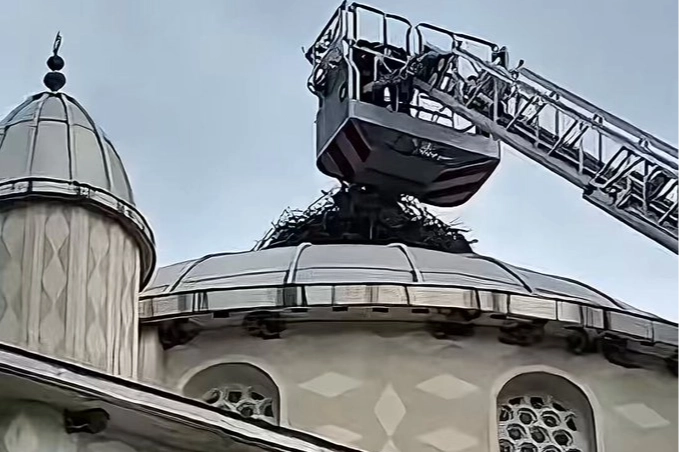 Cami kubbesine yuva yaparken sıkışan ve yaralanan kuş, itfaiye ekiplerinin dikkatli müdahalesiyle kurtarıldı.
