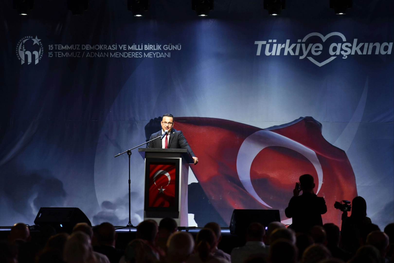 EGEMENLİK KAYITSIZ ŞARTSIZ MİLLETİNDİR! ‘’Bu aziz millet demokrasiyi 15 Temmuz'da bütün dünyaya göstermiştir. 15 Temmuz gecesi milli iradeyi hiçe sayanlar bir tek şeyi hesaba katmadı; egemenlik kayıtsız şartsız milletindir!’’ ifadeleriyle sözlerine başlayan Mustafakemalpaşa Belediye Başkanı Mehmet Kanar, 15 Temmuz'u unutmayacağız, unutturmayacağız. Gerek şehit yakınlarımız gerekse milletimizin tamamı bu duygularla bugünü anıyor. Şehitlerimiz bu ülkenin teminatıdır, ay yıldızlı bayrağımıza rengini veren kahramanlarımızdır. Bayrağımızdaki hilal bağımsızlığımızın sembolüdür, yıldızlar da her bir şehidimizin bir nişanesidir. Tüm şehitlerimizi minnet, saygı ve dua ile yad anıyorum, aziz hatırları önünde saygıyla eğiliyorum. Ruhları şad olsun’’ dedi. 15 Temmuz programı boyunca dev ekrandan 15 Temmuz 2016 gecesinin belgeselleri yayınlarından, duygu dolu anlar yaşandı. SELALAR ŞEHİTLER İÇİN OKUNDU Şehitlerimiz için Kuran-ı Kerim ve mevlidin ardından hain yapılanmanın TRT’de sözde bildiri okuttuğu 00.13’ü gösterdiğinde tüm minarelerden salalar yükseldi.