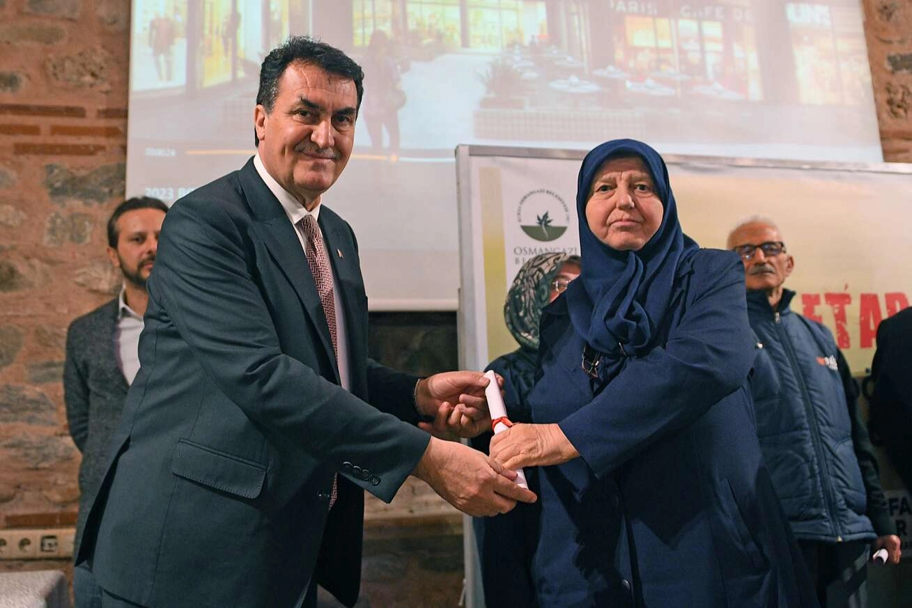Ördekli Kültür Merkezi’nde 15. Noter Başkâtibi huzurunda çekilen kuraların ardından 18 hak sahibi tapularını Osmangazi Belediye Başkanı Mustafa Dündar’ın elinden aldı.