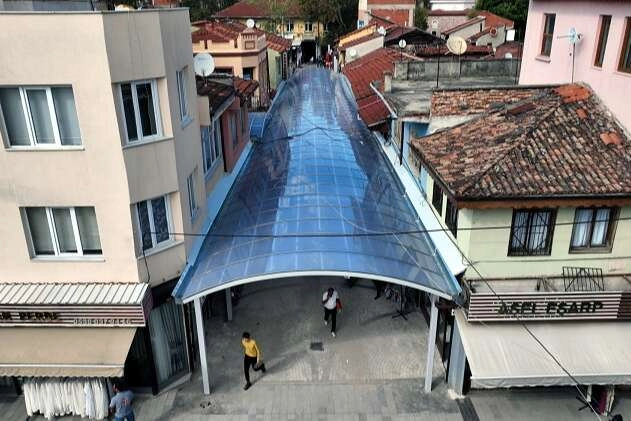 BURSA (İGFA) - Bursa’yı geleceğe taşıyacak projeleri kararlı adımlarla hayata geçiren Büyükşehir Belediyesi, ulaşımdan çevreye, altyapıdan tarihi kültürel mirasa kadar ilçelerde de yaşam kalitesini en üst seviyeye çıkarıyor. Yenişehir ilçesine değer katacak bir proje daha, ilçe merkezindeki tarihi Balibey Çarşısı’nda uygulanıyor. Bursa’daki tarihi çarşılarında yapılan estetik çatı kaplamanın bir benzeri, Yenişehir’in tarihi çarşısını oluşturan Ahmet Efendi, Arasta ve Kasaplar sokaklarında da uygulanıyor. Çalışmaların yüzde 90 oranında tamamlandığı proje kapsamında çarşı estetik görünüm kazanırken, vatandaşlar yaz-kış konforlu bir ortamda alışveriş yapma imkanına kavuşuyor.