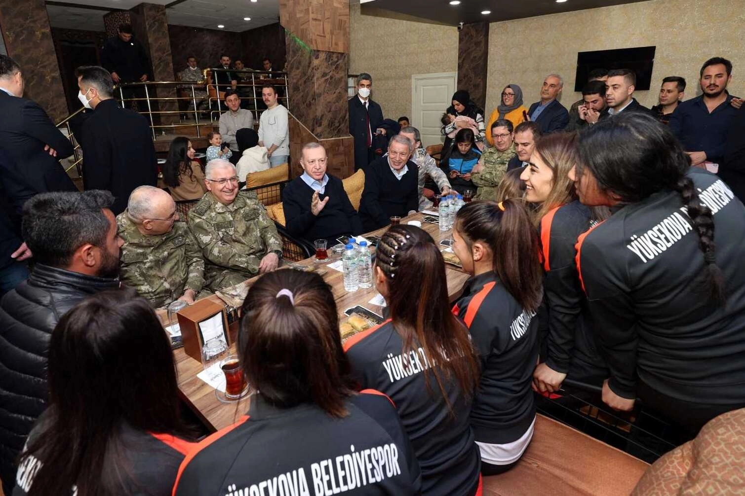 Beraberindeki Millî Savunma Bakanı Hulusi Akar ve TSK Komuta Kademesi ile bir süre pastanede oturarak gençlerle de sohbet eden Cumhurbaşkanı Erdoğan, pastanenin çıkışında vatandaşların yoğun ilgisiyle karşılaştı.