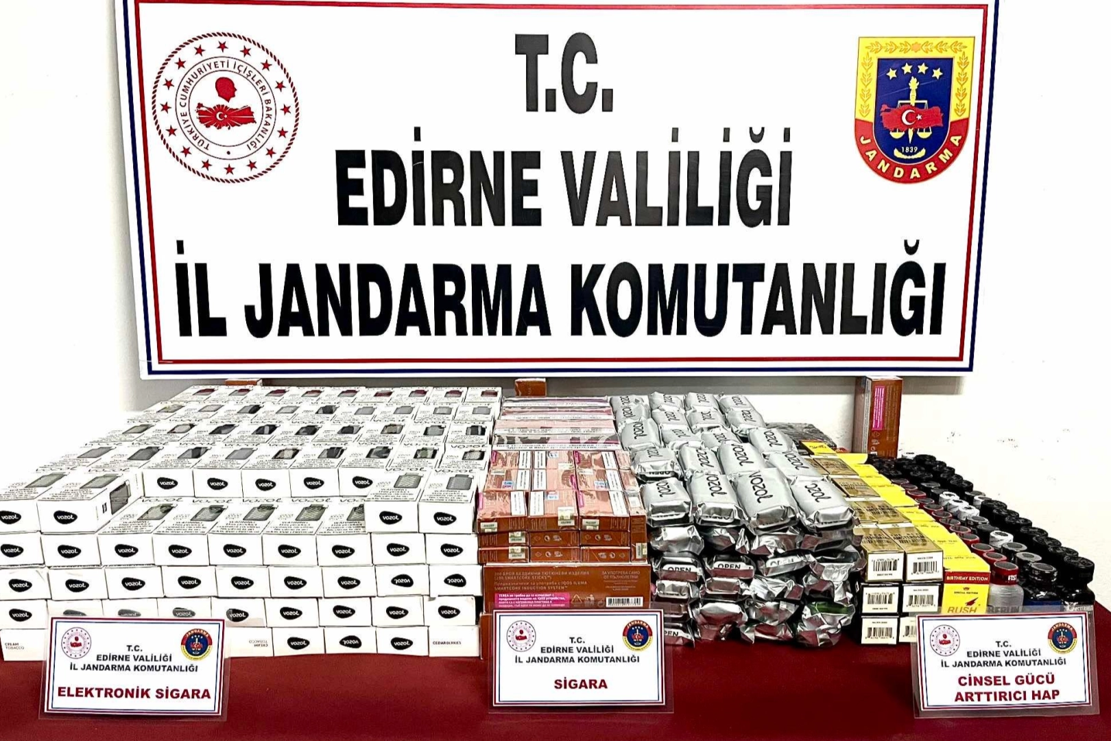 Erdoğan DEMİR / EDİRNE (İGFA) - Edirne İl Jandarma Komutanlığı ekiplerince yapılan çalışmalar neticesinde, Uzunköprü ilçesi İpsala Sınır Kapısı güzergahında bir araçta yapılan aramada; 350 adet elektronik sigara, 900 adet kaçak sigara, 334 adet cinsel güç artırıcı hap ele geçirildi.
