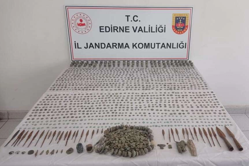 Erdoğan DEMİR-Keşan Postası (EDİRNE İGFA) Edirne İl Jandarma Komutanlığı KOM Şube ekiplerince icra edilen Kültür ve Tabiat Varlığı Kaçakçılığı ile Mücadele faaliyetleri kapsamında; Uzunköprü ilçesi Mescid Mahallesi'ndeki evde yapılan arama neticesinde, Bizans ve Roma dönemlerine ait olduğu değerlendirilen 3 bin 130 bronz sikke, 2 mızrak ucu, 39 ok ucu, 3 yüzük, 1 mühür, 2 minyatür heykel, 4 obje, 1 broş ve 1 kolye ve olmak üzere toplam 3 bin 183 adet tarihi eser ile 30 tabanca fişeği ele geçirildi.