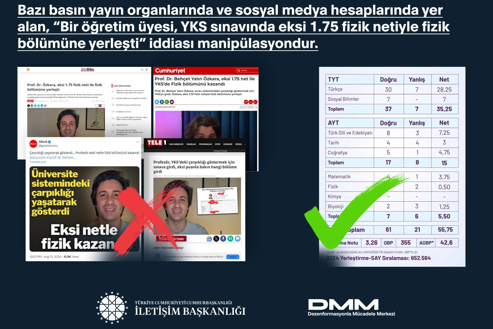 ANKARA (İGFA) - İletişim Başkanlığı, bazı basın yayın organlarında ve sosyal medya hesaplarında yer alan, “Bir öğretim üyesi, YKS sınavında eksi 1.75 fizik netiyle fizik bölümüne yerleşti” iddiası manipülasyon olduğunu açıkladı.