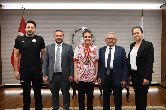Mehmet UZEL (KAYSERİ İGFA) Kayseri Büyükşehir Belediye Başkanı Dr.Memduh Büyükkılıç, görme engelliler kategorisinde Avrupa’ya ilk giden ve madalya alan, bugüne kadar da 35 madalya sahibi olan Büyükşehir Belediyesi Spor A.Ş. yüzücülerinden Mustafa Eminoğlu Anadolu Lisesi 9. sınıf öğrencisi 14 yaşındaki Cemre Ateş’i makamında kabul etti.
