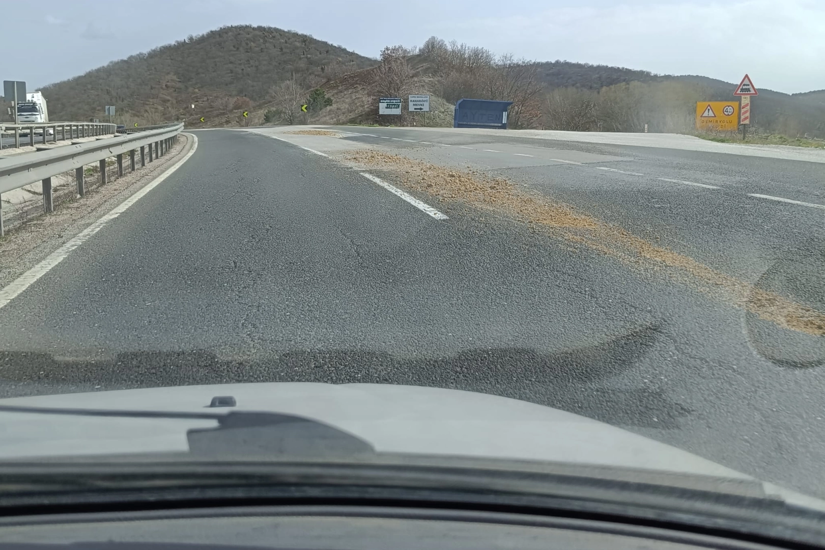 Bilecik - Bozüyük karayoluna dökülen kumlar, trafikte tehlikeye sebep oldu.