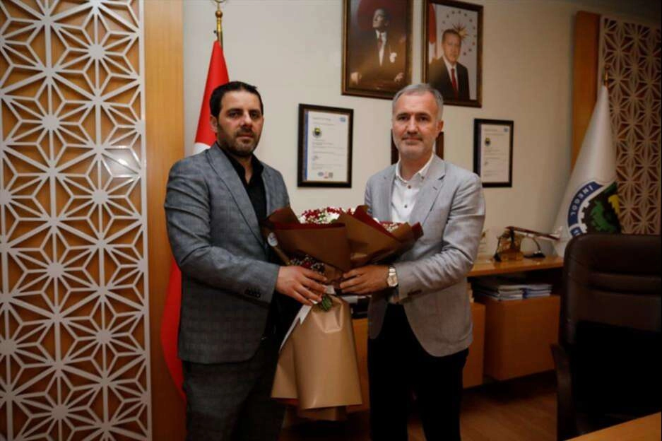 Ziyarette Kani Ademoğlu, Başkan Alper Taban’a çiçek takdiminde de bulundu.