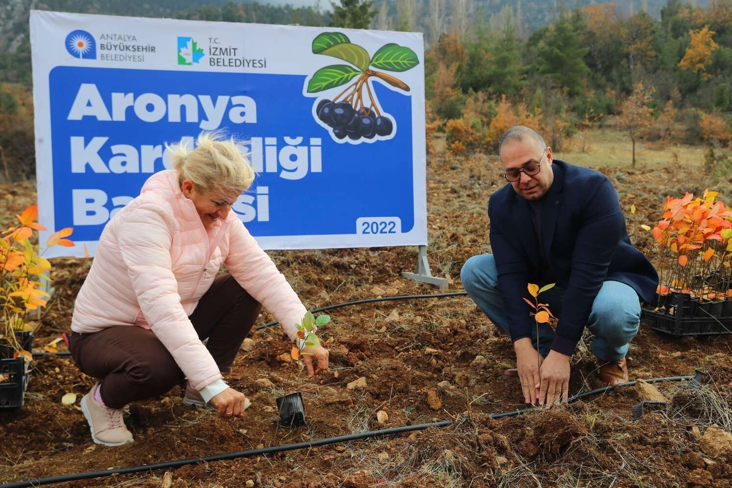 İzmit Belediyesi ile Antalya Büyükşehir Belediyesi’nin üretime yönelik yaptığı işbirliği çalışmaları hız kesmeden devam ediyor. ‘Süper meyve’ olarak adlandırılan aronya bitkisi Antalya Halkına da şifa olacak. İzmit Belediyesi ve Antalya Büyükşehir Belediyesi ortaklığında kurulan Aronya Kardeşliği bahçesinde 2 dönüm alana 500 adet Aronya fidesi dikimi yapıldı.