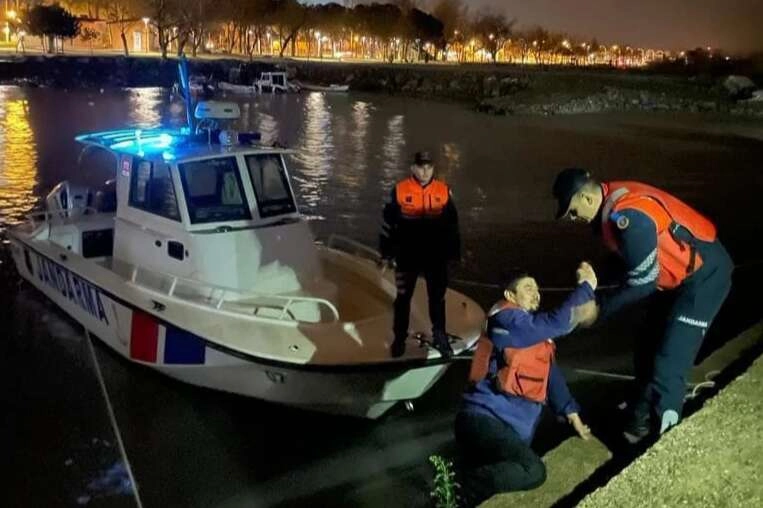 Mahsur kalan iki kişi ve tekne, jandarma botuyla kurtarılıp sahile getirdi.