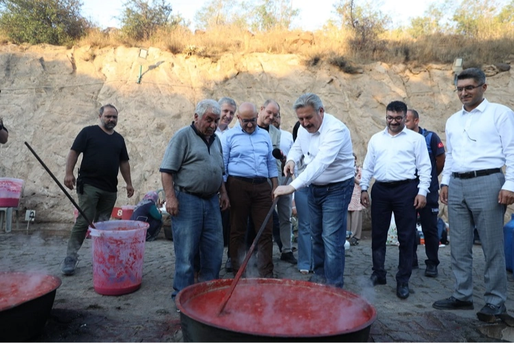Bunu nasıl çözeriz derken bu fikir aklımıza geldi. Şuanda burada 50 tane bakır kazanımız kaynıyor. Rekor bir sayıda bir başvuru var bu sene. Geçen sene bin aileyi geçmiştik bu sene 3 bin aileyi geçtik. Yani bu sene yaklaşık 12-13 bin nüfusa hizmet veriyor durumdayız. Bütün ilçelerden gelen vatandaşlarımız var. Burada vatandaşlarımız aileleri ile birlikte güzel vakit geçiriyor, kaynaşıyorlar. Şarkılar, türküler burada güzel bir aile ortamı oluyor. Gurbetçilerimiz var, ilçelerden gelenlerimiz var ailecek burada zaman geçiriyorlar. Bir aydır Belsin’de Kocatepe mahallemizdeydik. 3 hafta kadar da buradayız. 7/24 saat yani 3 vardiyalı sabah, öğlen ve gece hiç fark etmiyor. 24 saat arkadaşlarımız burada hizmet veriyor. 100’ün üzerinde personelimiz alanda çalışıyor. Vatandaşlarımız son derece memnun. Burada vatandaşlarımız belediyemizin sağladığı birçok imkânla zahmete girmeden nezih, temiz bir ortamda salçalarını kaynatan tüm vatandaşlarımızın salçası bereketli hanesi huzurlu olsu