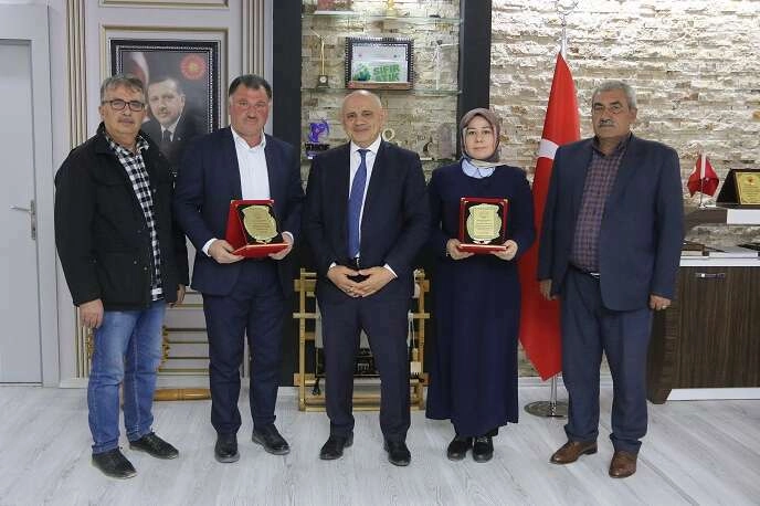 Mehmet UZEL (KAYSERİ İGFA) Kayseri'nin Yahyalı Belediye Başkanı Esat Öztürk ’ün makamında yapılan encümen toplantısının ardınsan görev süreleri dolan Meral Koşar ve Adem Sarıçiçek’e teşekkür plaketleri Yahyalı Belediye Başkanı Esat Öztürk tarafından verildi.