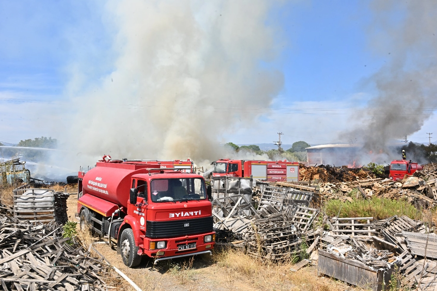 MANİSA (İGFA) - Manisa Büyükşehir Belediyesi İtfaiye Dairesi Başkanlığı ekipleri, Muradiye Mahallesi’ndeki ahşap palet fabrikasının depo alanında çıkan yangına müdahale edildi.