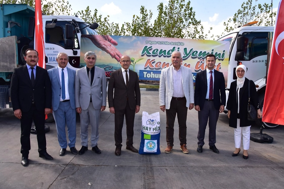 Kırsal Hizmetler Dairesi Başkanlığı tarafından temin edilen 30 tonluk yem tohumu; Manisa Büyükşehir Belediyesi Kırtık Şantiyesi’nde düzenlenen törenle ilçelere gönderildi. Yem tohumu dağıtımına Manisa Büyükşehir Belediyesi Başkanvekili Mehmet Güzgülü, Kırsal Hizmetler Dairesi Başkanı Yılmaz Usta, Fen İşleri Dairesi Başkanı Uğur Topkaya, Zabıta Dairesi Başkanı Evren Yıldız, Kaynak Geliştirme ve İştirakler Dairesi Başkanı Ersoy Vitaş, MHP İl Başkan Yardımcısı Muammer Babuş, MHP Şehzadeler İlçe Başkanı Şener Özten, meclis üyeleri ve şube müdürleri katıldı.