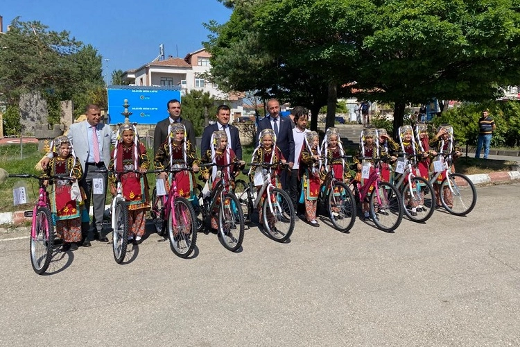 Halk oyunu kostümlerini giyen ve bisikletlerle poz veren öğrenciler, Başkan Büyükkılıç’a teşekkür ettiler.