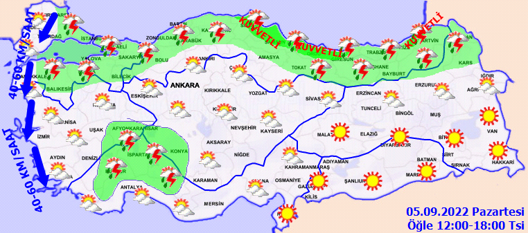 RÜZGAR: Genellikle kuzeyli, Akdeniz kıyıları ile güneydoğu kesimlerde güneyli yönlerden hafif, ara sıra orta kuvvette, Marmara'nın batısı ile Kıyı Ege'de kuvvetli ve yer yer kısa süreli fırtına (40-70 km/sa) şeklinde eseceği tahmin ediliyor.
