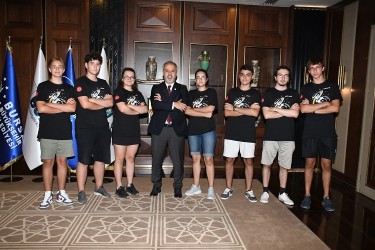 BURSA (İGFA) - Bursa’nın başarılı eğitim kurumlarından Özel Şahinkaya Koleji Academy ve Hexagon Kampüs öğrencilerinden oluşan Merküt Roket Takımı, 20 Ağustos Pazar günü Tuz Gölü’nde gerçekleşecek olan TEKNOFEST Teknoloji Yarışmaları finaline gitmeden önce Bursa Büyükşehir Belediye Başkanı Alinur Aktaş ile Sanayi ve Teknoloji Bursa İl Müdürü Latif Deniz’i makamında ziyaret ettiler.