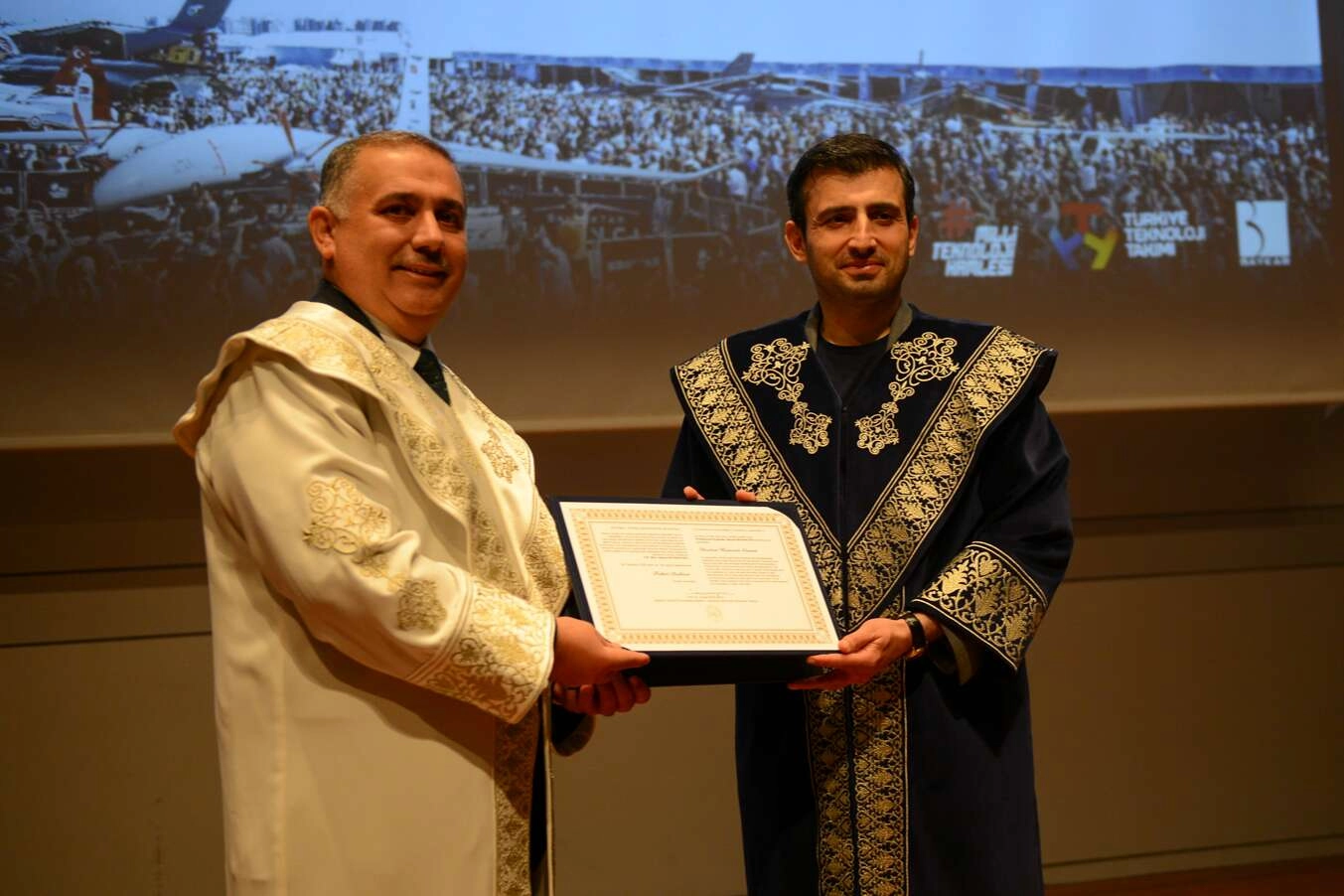 “Yapmış olduğu üst düzey araştırma geliştirme faaliyetleri ve bu faaliyetlerin sonucunda ortaya çıkan ürünleri ile bilimin ve teknolojinin ilerlemesine katkıda bulunması, çalışmaları ile yurt kalkınmasına, ülkemizin ekonomik ve sosyal gelişimine katkıda bulunması, Türk teknolojilerinin dışa açılması ve böylece teknik ve ekonomik gücümüzün uluslararası düzeyde etkinlik kazanmasına imkân sağlamış ve mesleğindeki çalışmalarında üstün başarısını kanıtlamış olması” dolayısıyla fahri doktor unvanı alan Elektronik ve Haberleşme Mühendisliği Bölümü 2002 yılı mezunumuz Selçuk Bayraktar, “fahri doktor” beratını Rektörümüz Prof. Dr. İsmail Koyuncu’nun elinden aldı.
