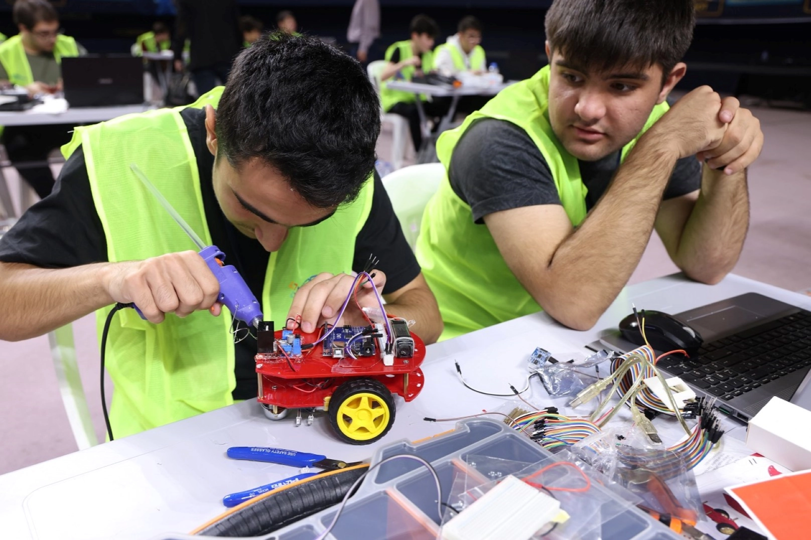 KODELİG’23 yarışmaları kapsamında 1. gün yapılan “Tasarla Çalıştır” kategorisinde finale kalan öğrenciler Şehit Polis Recep Topaloğlu Spor Salonu’nda gerçekleştirilen robot tasarlama yarışmasında ter döktü. Kendi tasarladıkları robotları yapmak için yarışan katılımcılar verilen sürede görevi tamamlamak için ekip halinde çalıştı. Gün sonunda yazılımı ve tasarımı kendilerine ait olan robotlar hazırlayan katılımcılar hazırlanan parkurda 25 Ekim Çarşamba günü yarışmak için beklemeye başladı.