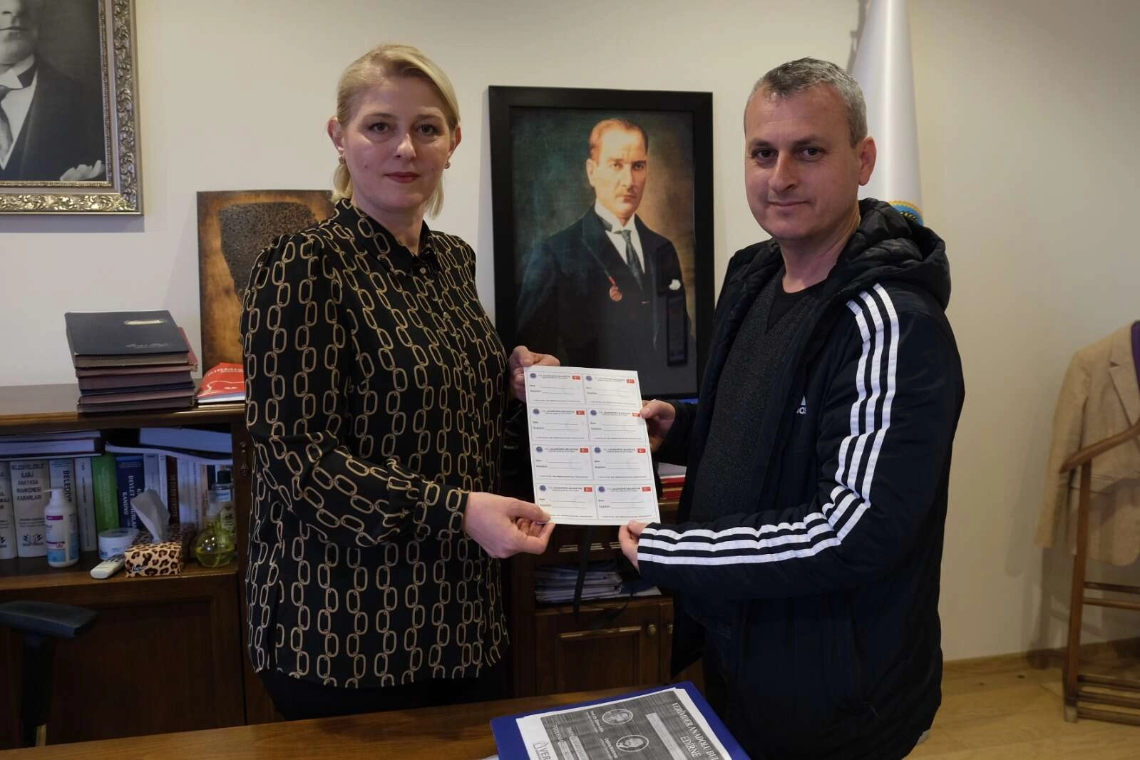 Uzunköprü Belediye Başkanı Özlem Becan , Depremzede vatandaşlar için hazırlanan ulaşım kartlarını, Santer Taşımacılık Kooperatifi Yönetim Kurulu Başkanı Savaş Özen'e takdim etti.