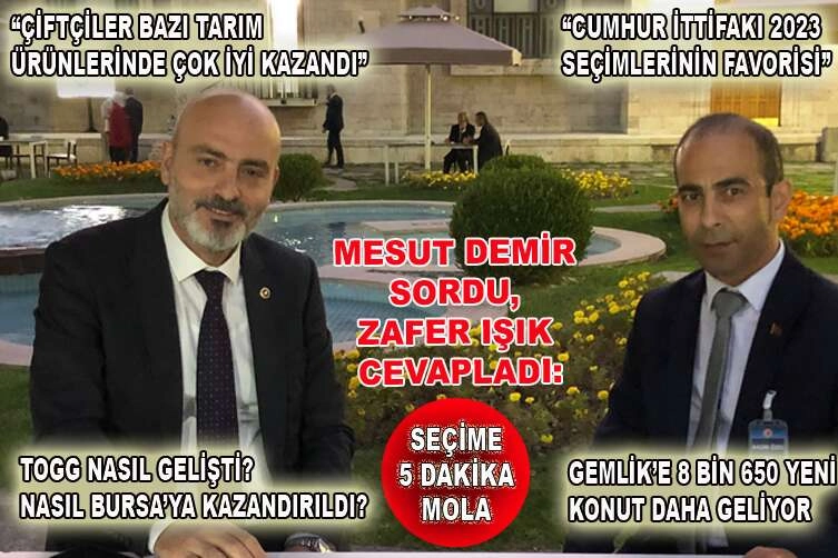 AK Parti Bursa Milletvekili Zafer Işık ile TBMM Genel Kurulu arası kulis bahçesinde “Seçime 5 Dakika Mola” dedik. Hem müjde verdi, hem seçimleri ve gündemi değerlendirdi.
