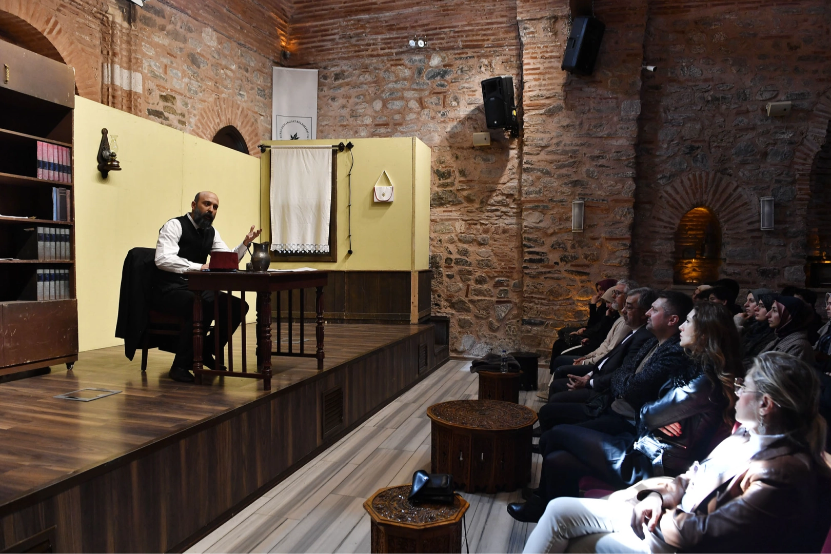 BURSA (İGFA) - Bursa'nın Ördekli Kültür Merkezi’nde gerçekleşen tek kişilik oyuna Osmangazi Belediye Başkan Yardımcısı Bülent Hamdi Cingil ile öğrenciler yoğun katılım gösterdi. Burak Akyüz’ün yazdığı, Murat Ozan’ın yönettiği, Emre Nurettin Örük’ün ise Mehmet Akif Ersoy’u canlandırdığı oyun boyunca vatan şairinin aile hayatının yanı sıra cephe ve milli mücadelede üstlendiği rolü ile İstiklal Marşı’nı yazdığı dönemde geçirdiği zor günlere değinildi.