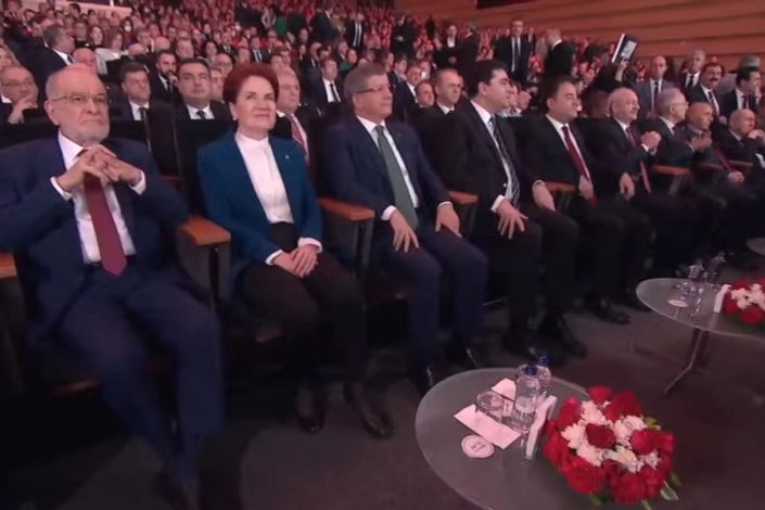 CHP Genel Başkanı Kemal Kılıçdaroğlu, İYİ Parti, Genel Başkanı Meral Akşener, DEVA Partisi Genel Başkanı Ali Babacan, Gelecek Partisi Genel Başkanı Ahmet Davutoğlu, Saadet Partisi Genel Başkanı Temel Karamollaoğlu ve Demokrat Parti Genel Başkanı Gültekin Uysal, salona birlikte giriş yaptı ve alkışlarla karşılandı.