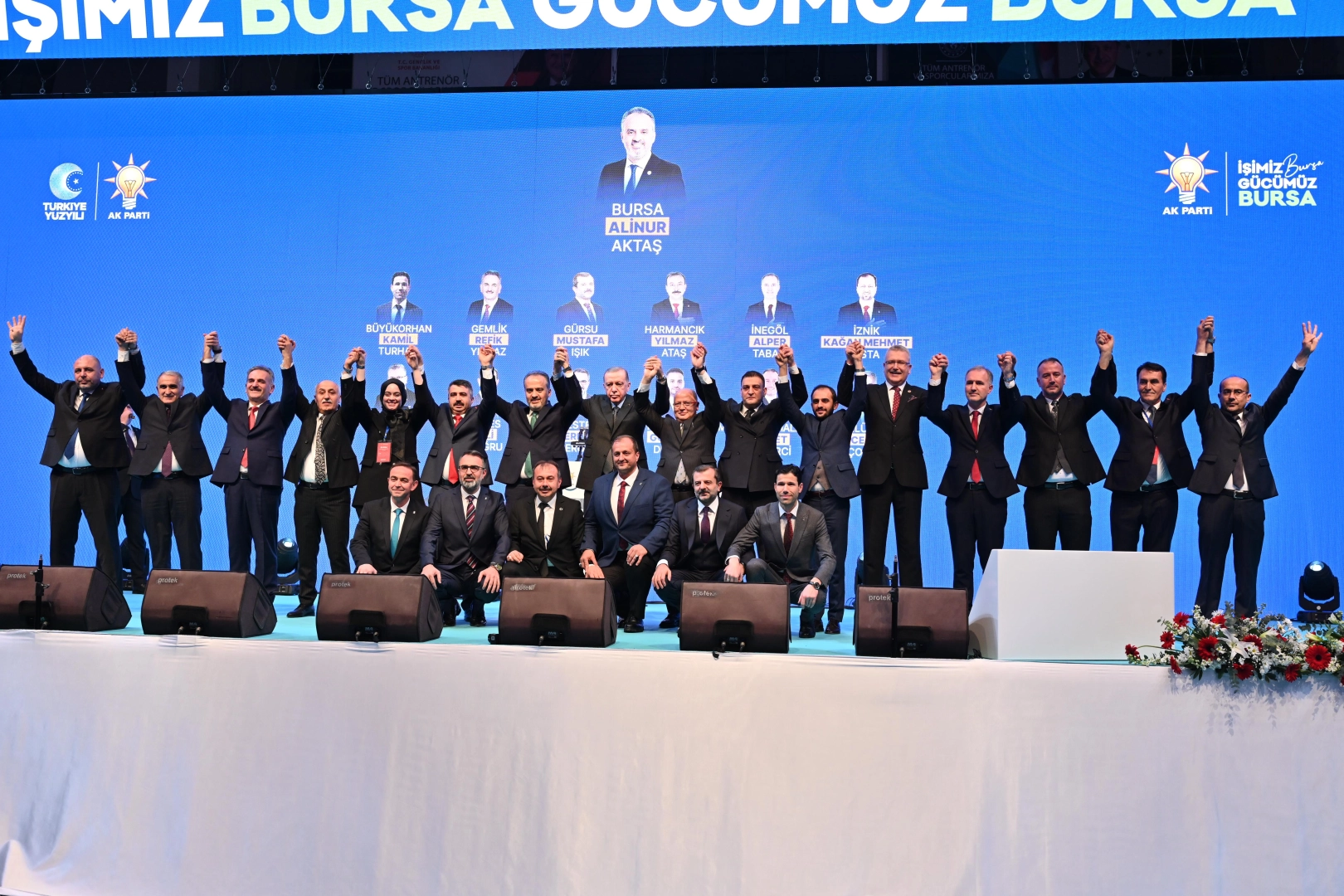 Salonun ambiyansı konusunda büyük beğeni toplayan Bursa Büyükşehir Belediye Başkanı Alinur Aktaş ve AK Parti Bursa İl Başkanı Davut Gürkan’ın ellerini kaldıran Cumhurbaşkanı Erdoğan, hem partililere hem de seçmene birliktelik mesajı verdi.