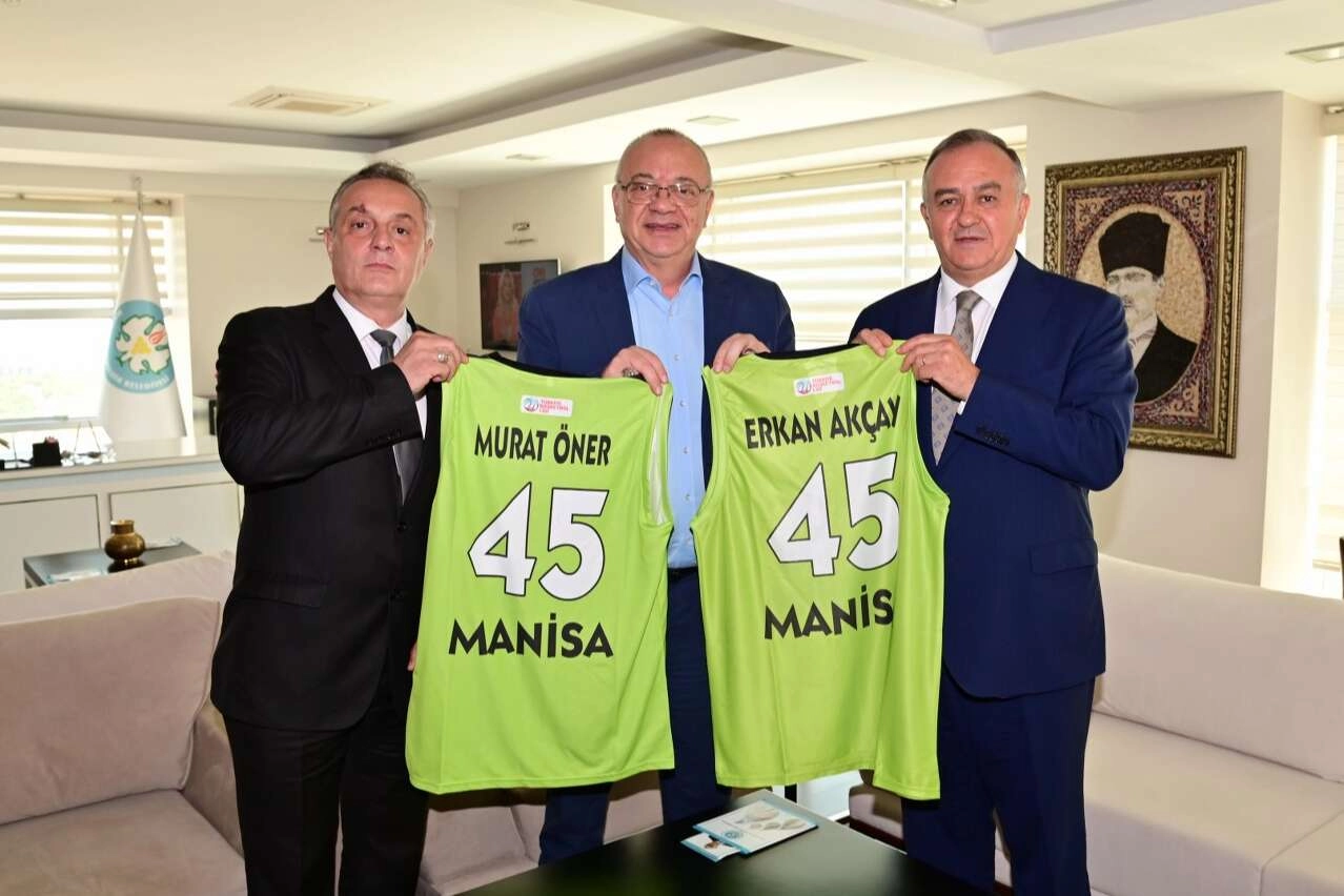 Başkan Ergün, MHP Grup Başkanvekili Erkan Akçay ve MHP Manisa İl Başkanı Murat Öner’e Manisa 2022-2023 sezonunda Basketbol Süper Ligi’nde mücadele edecek olan Şampiyon Manisa Büyükşehir Belediyespor’un formasını hediye ederek, yeni sezonda tüm maçlara davet etti.