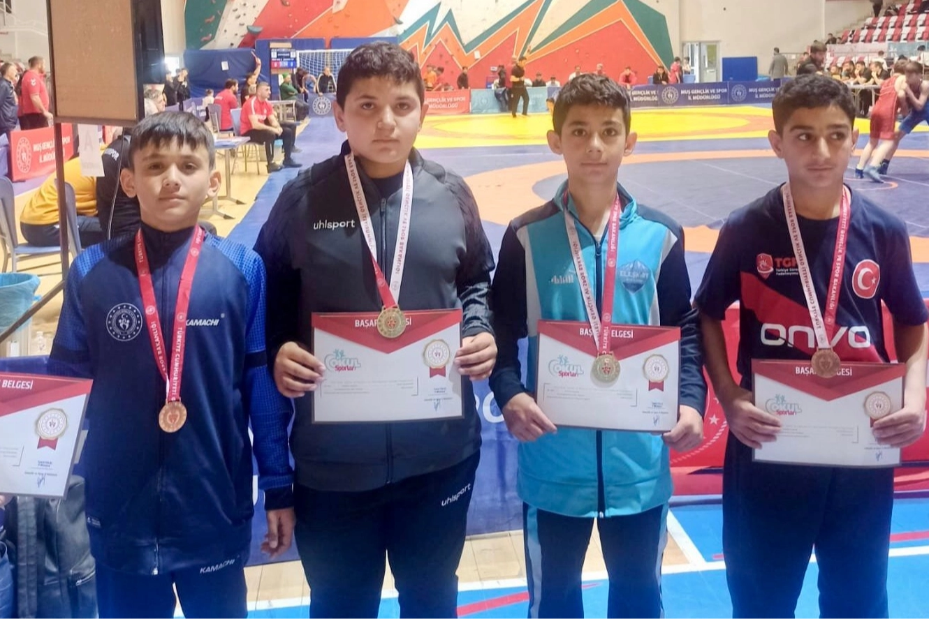 Nihat AYDIN / AĞRI (İGFA) - Muş’ta düzenlenen Okullar Arası Küçükler Güreş Grup Şampiyonası’nda turnuvayı 2 altın ve 2 bronz madalya ile tamamlayan Ağrılı sporcular, performanslarıyla dikkat çekti.