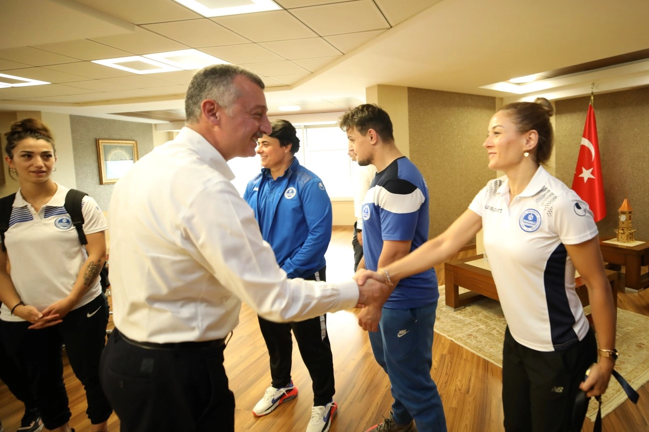 Başkanlık makamında sporcuları konuk eden Başkan Büyükakın, Judoda rakiplerini saf dışı bırakan Merve Azak, Tuğçe Beder, Ömer Kemal Aydın’ı, Tekvando alanında rakiplerini birer birer deviren Esila Deniz’i, atıcılıkta hedefi 12’den vuran Oğuzhan Tüzün ve Mustafa Serhat Şahin’i, karatede derece yapan Tuba Yakan, Burak Mert Can ile halter alanında dünyaları kaldıran Berfin Altun ve Ceren Akarsu’yu tek tek tebrik etti.