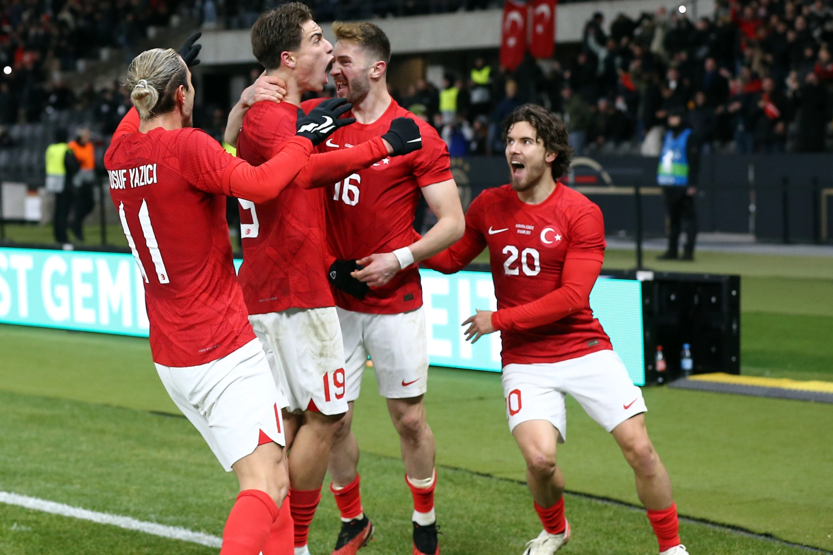 A Millî Takımımız, özel maçta karşılaştığı Almanya'yı deplasmanda 3-2 mağlup etti. Berlin'deki Olimpiyat Stadı'nda oynanan müsabakada Ay-Yıldızlılarımızın gollerini 38. dakikada Ferdi Kadıoğlu, 45+2. dakikada Kenan Yıldız ve 70. dakikada penaltıdan Yusuf Sarı atarken, rakibimiz Almanya'nın gollerini 5. dakikada Kai Havertz ve 49. dakikada Niclas Füllkrug kaydetti. Türkiye Futbol Federasyonu Başkanı Mehmet Büyükekşi, Başkan Vekilleri Yalçın Orhan, Yusuf Günay, Agah Ruşen Çetin, Mustafa Eröğüt ve Alkın Kalkavan, Yönetim Kurulu Üyeleri Müslüm Özmen, Hamit Altıntop, Volkan Can ve Ramazan Üçdan ile Genel Sekreter Taner Senseven karşılaşmayı tribünden takip etti. A Millî Takımımız, çıkmayı garantilediği UEFA EURO 2024 Elemeleri D Grubu'ndaki son maçında 21 Kasım Salı günü TSİ 22.45'te Galler ile deplasmanda grubunu lider bitirebilmek karşı karşıya gelecek.