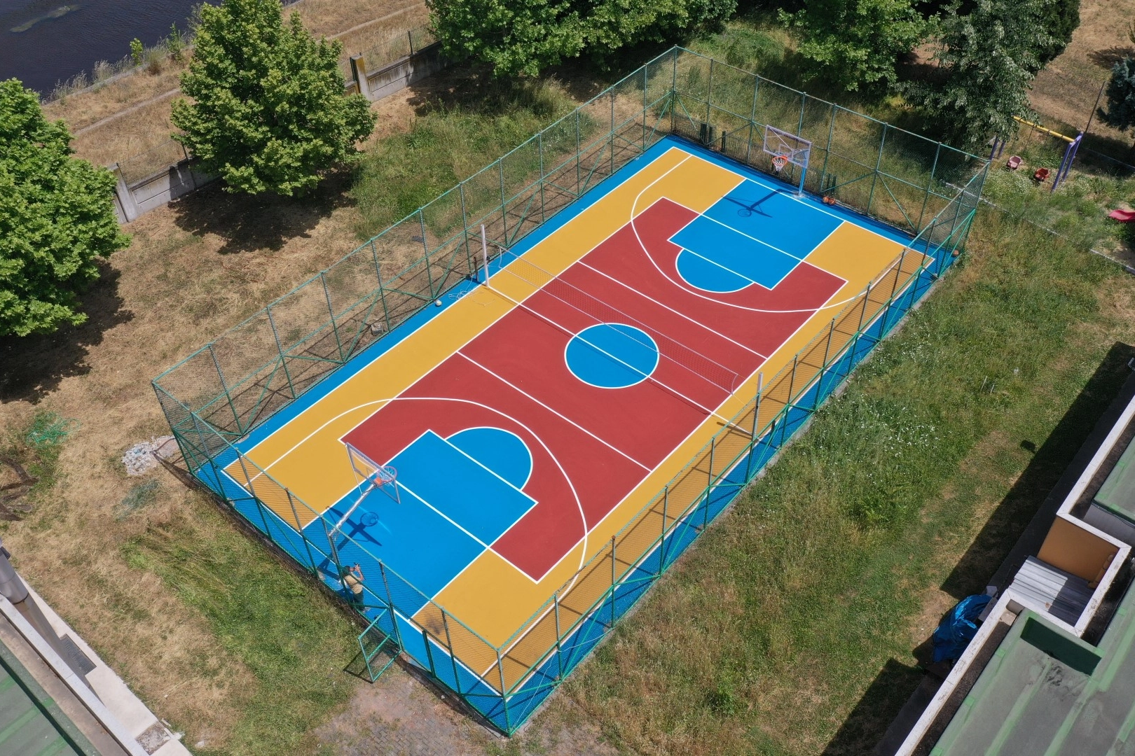 Çalışmalara başlayan ekipler, bahçesine asfalt serimi gerçekleştirdiği okullara iki pota ve bir adet voleybol seti monte etmeye başladı.