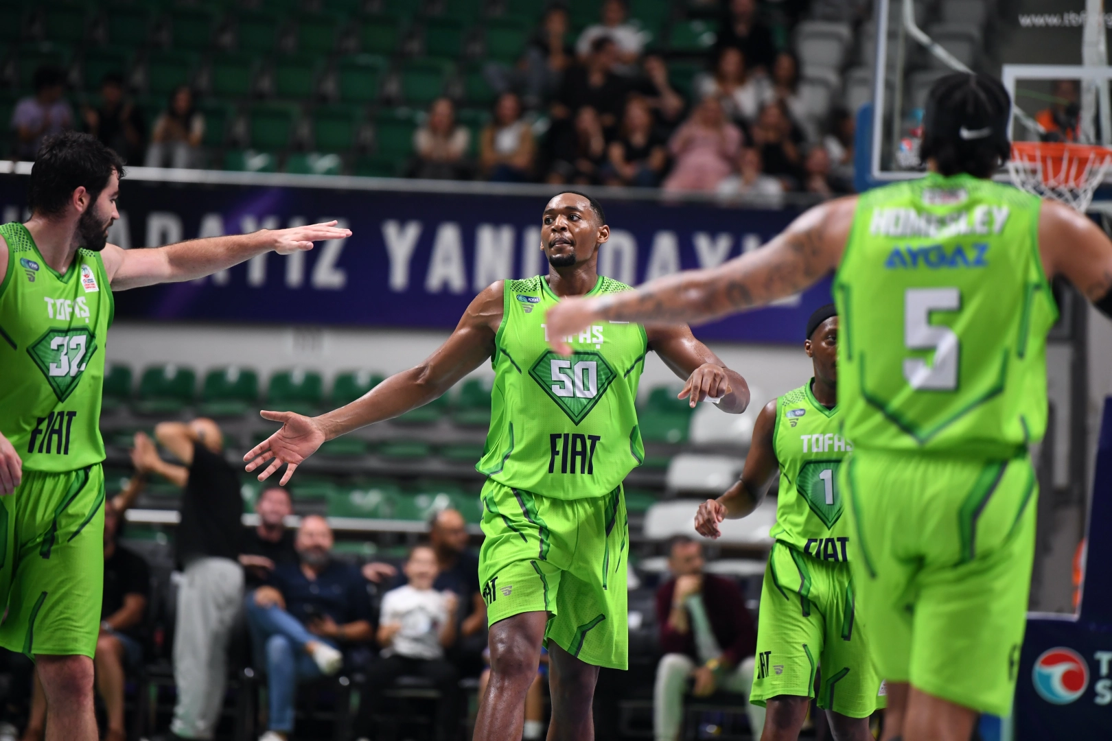 TOFAŞ Spor Salonu’nda oynanan maça Cassius Winston, Caleb Homesley, Mustafa Kurtuldum, Luke Maye, Austin Wiley beşiyle başlayan Bursa ekibi, ilk basketini Austin Wiley ile buldu.