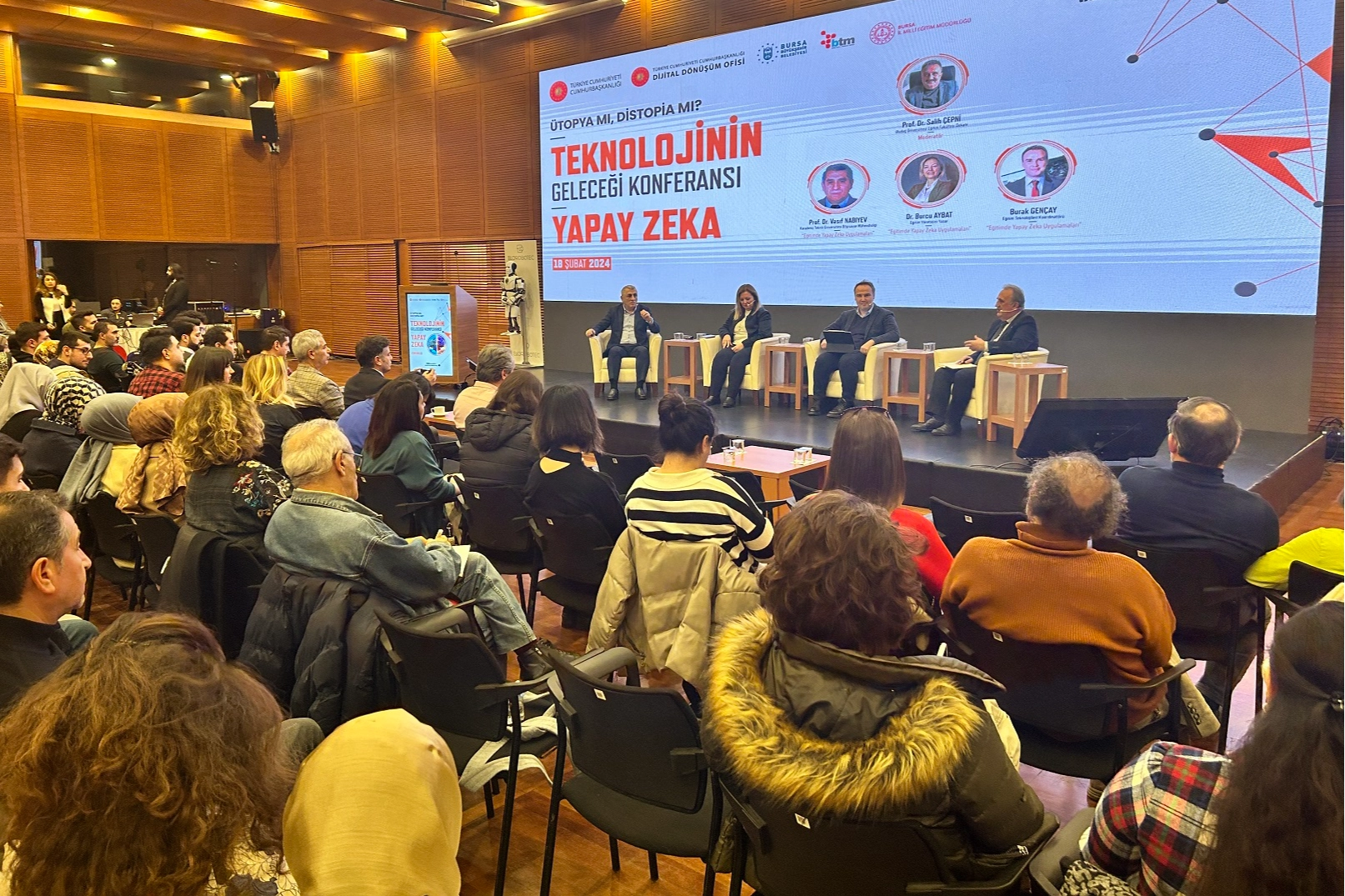 GAMZE TUNA / BURSA (İGFA) - Bursa Büyükşehir Belediyesi’nin Türkiye Cumhuriyeti Dijital Dönüşüm Ofisi, İl Milli Eğitim Müdürlüğü ve Bursa Bilim ve Teknoloji Merkezi'nin işbirliğiyle düzenlediği Teknolojinin Geleceği Konferansı’, Atatürk Kongre Kültür Merkezi’nde yapıldı. Ana teması ‘Yapay zeka’ olan konferansın açılış törenine, Büyükşehir Belediyesi Başkanvekili Arif Bayrak, İl Milli Eğitim Müdürü Dr. Ahmet Alireisoğlu, akademisyenler ve çok sayıda öğretmen katıldı. Konferansta, yapay zeka alanında güncel çalışmalar, karşılaşılan sıkıntılar, eğitim ve diğer alanlardaki yeni fikirler konuşulurken, ‘yapay zeka ütopya mı? distopya mı?‘ sorusuna da cevap arandı.