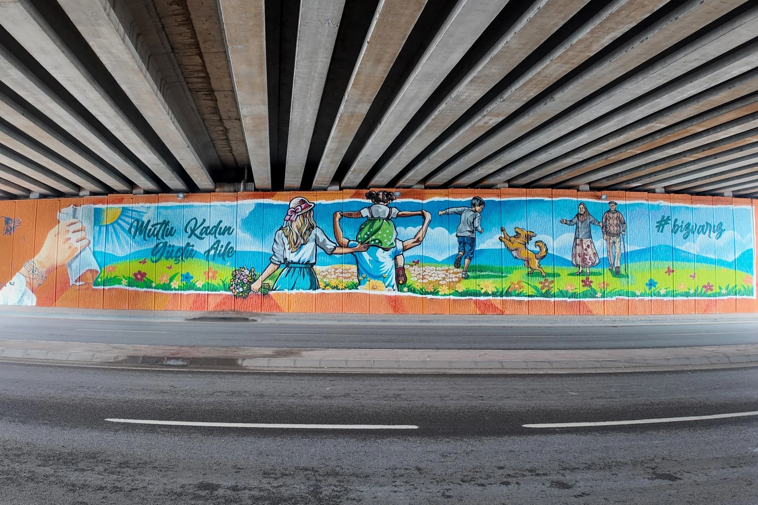 Kadın ve Aile Hizmetleri Dairesi Başkanlığınca yapılan, Aile ve Sosyal Hizmetleri İl Müdürlüğünce destek verilen grafiti çalışmasında turuncu kırmızı ve mavi renkler ağırlıklı olarak kullanıldı. Kullanılan renklerin etkileyici uyumu hem görsel odak oluştururken hem de mesajın daha net algılanmasına katkı sağladı.